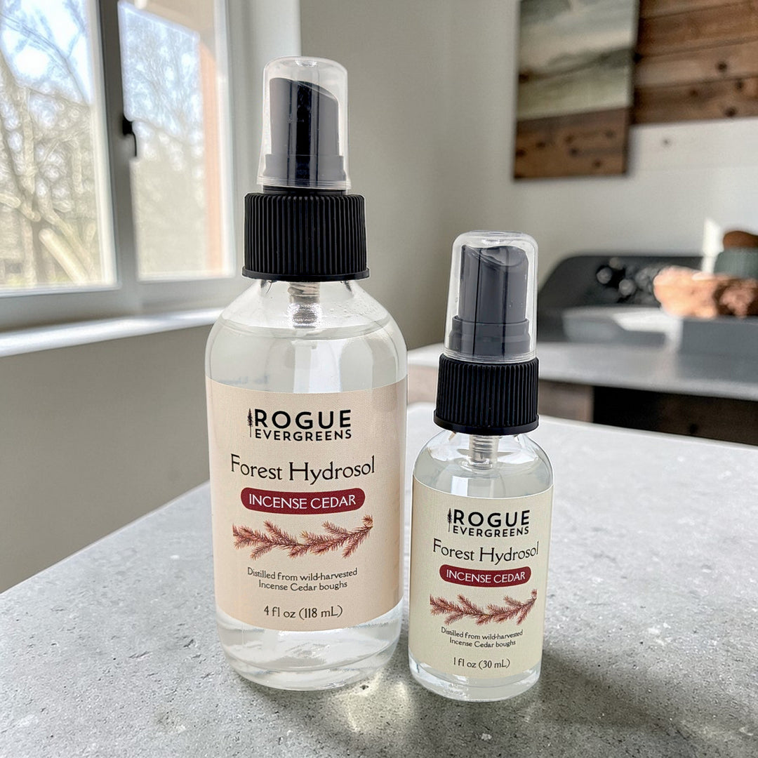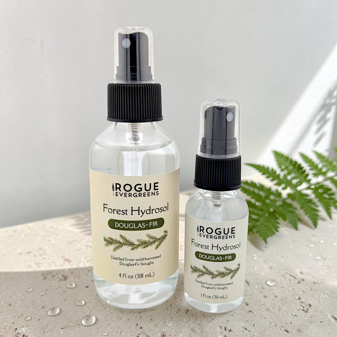 Gentle forest water for your skin. Our Forest Hydrosols are the aromatic waters captured during small-batch steam distillation of wild-harvested conifer boughs. They're not diluted essential oils. They're a distinct product, carrying water-soluble plant compounds that essential oils don't capture. Use them as a facial toner, aftershave, or body mist for gentle, pH-balanced hydration. The scent is subtle and fades within minutes. Each species has its own character. Available in Douglas-fir, Grand Fir, Noble Fir, Ponderosa Pine, and Incense Cedar.